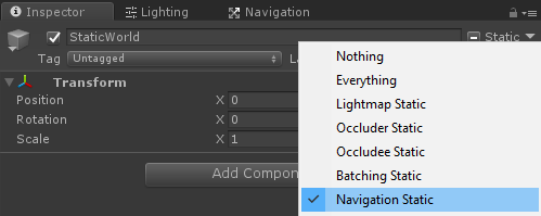 Ikke glem å merke alle statiske objekter i scenen som navigasjonsstatiske før du baker NavMesh: