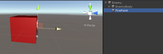- For Fire Point, lag et nytt GameObject, flytt det inn i den levende fiendeforekomsten og plasser det litt foran forekomsten, og tilordne det til Fire Point-variabelen: