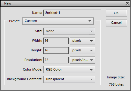 - Sett bredden og høyden til noe lite (i mitt tilfelle starter jeg med å lage en bakkeflis, så bredden og høyden er satt til 16)