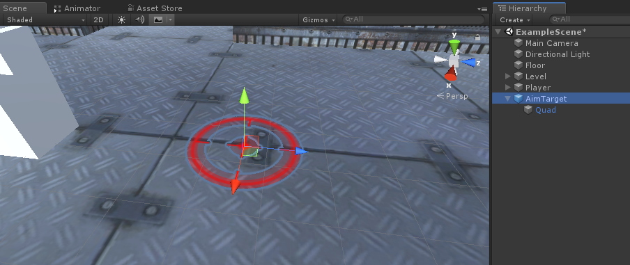 - Lag en ny Quad (GameObject -> 3D Object -> Quad) og flytt den inn i "AimTarget" objektet