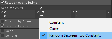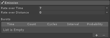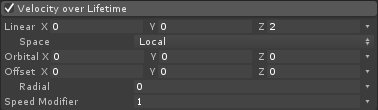 - Aktiver disse modulene i partikkelsystemet: Emisjon, Form, Velocity over Lifetime, Color over Lifetime, Size over Lifetime , Rotasjon over levetid, Eksterne krefter, Gender.