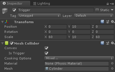 - Legg til MeshCollider-komponenten til "Trigger" GameObject, merk av for Convex og IsTrigger avmerkingsboksene, og endre dens mesh til standard sylinder